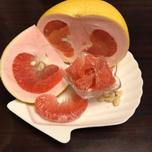 晩白柚(ばんぺいゆ) ビッグマーケットで大きなザボンに魅かれ、買いました🤩❣️ 1個1kg超え‼️重いです⚖ 家庭用のスケールがエラーになり測れません😨💧 長い人生の間に、修学旅行で九州へ行った時と、今回で2度目の実食🍊 このザボンは果肉も皮の内側も綺麗なピンクです😍 果肉がシッカリ! 少しジューシーさは欠けますけど、お味はほぼグレープフルーツと同じに酸っぱくなくて食べやすいです👍😋🎶 種子は植えて見ようかしら😙 多分、植えても無理ですね😝💧