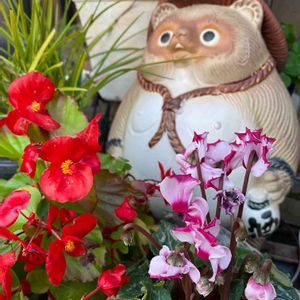 今晩は~今日のお花シクラメン2回めです。 ベゴニアと狸ちゃんも🧚♀️この子達一緒に夕日を眺めてます…今日も☀️綺麗やねぇ🎶