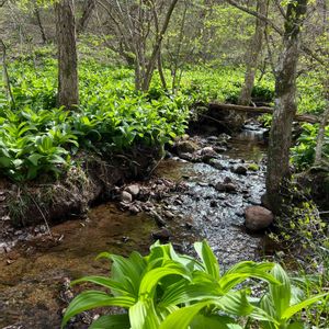 我が家のやまを流れる小川。 カタクリもショウジョウバカマも 花は終わり バイケイソウがモリモリしてきたしまよ🌿🎶