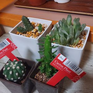 いいね👍️履歴見たら120あってビックリ(* >ω<)連投したからお手数かけてすいません ファロワーの皆さん、いつもいいね下さる皆さん、新規の皆さん とても嬉しいです💖感謝 左下のザボさん白いドットが、可愛くてお迎えしました名前が分かりません 右下名札がウチワサボテンですが絶対違うと私は思うのでお名前教えて下さい🎵 ガガ様も植え替えました洋風スタイリッシュな感じに仕上がりました♪ 徒長したハオ様もいい感じに見えます