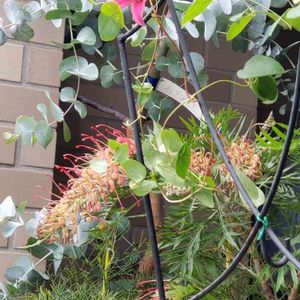 雨の後の晴れは清々しくて、植物も人間も気持ちが良いですね~💕 バラが咲いても終わっても変わらずに葉っぱもお花も順調に咲き続けているグレビレア…ゴートンに銀丸葉のユーカリさん😊有りがたいですね🌿🌸 そして、クレマチス👸ダイアナさん🌹 ちょっとずつしか咲かないけど、咲いたときは1個だけでも華やかさがあります流石です❣️