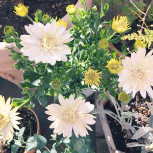 春ですねぇ 近所の花屋のセールで衝動買い^_^ フランネルフラワーと迷いましたが、 オステオスペルマム だって アキラの八重咲きかな