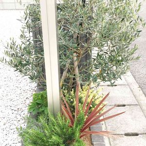 門柱周りの花壇𖡼.𖤣𖥧. ローズマリーがひと回り以上大きくなりました◟́◞̀ 去年虫にやられたけど復活しました↟⍋* オリーブも軽く剪定しました◟́◞̀