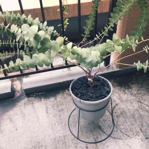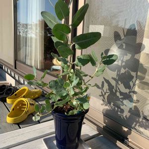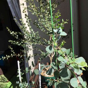 鉢含めて70cmくらいのたぶんユーカリグニー?さんをお迎え。リビングに置こうかと思ってたのに、ねこさんが食べようとするからベランダに移動🤣💦
