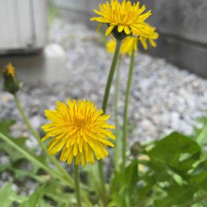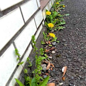 たんぽぽがお家の塀に沿って一列に🌼 見る限りは土なんて殆ど無さそうなのに、逞ましいなぁ⤴︎✨