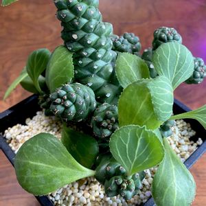 ユーフォルビア(モナデニウム) リチェイ 一部が茶色く枯れて、縮こまる感じになりました。こうやって茎を更新してる植物なんですかね。そんな性質はガガイモっぽい感じです。 二枚目は 一枚目の親株から独立させた仔株。もう ふっくらして新しい茎が出そうです。