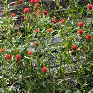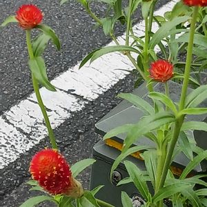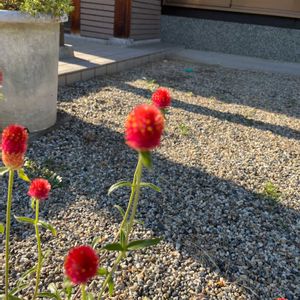 センニチコウ🔴ストロベリーフィールド ① こぼれ種のストロベリーフィールドが咲き始めました。 ② 一列に並ぶストロベリーフィールドの芽🌱🌱🌱 こぼれ種なのですが、砂利の通路脇で見事に並んでいます。 水撒きの時にホースが通るし私も踏むし👣 ここで咲きたいというのなら抜いたりしませんけど、倒れると本当に邪魔なので、今のうちに軽くピンチだけしようかな✂️