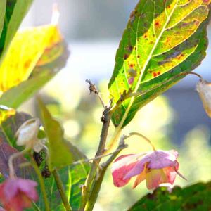 お盆に飾ったホオズキ提灯 役目を終えたあとはこうして庭に吊るします 雨風太陽にさらされて、少しずつ枯れ朽ちてゆく 夏が終わる頃には葉脈だけの透かしホオズキに