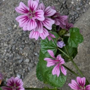 ウスベニアオイとゼニアオイは良く似ています。 花びらの形、葉っぱ形からゼニアオイだと思います。 道路と歩道の間から生えていました。