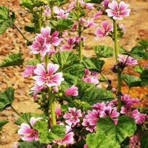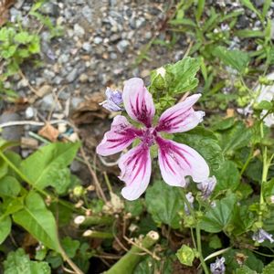 ゼニアオイはピンク色で紫の線の入った五弁の花が咲く、凄く良く似た「今日のお花」ウスベニアオイと違う点は丸みを帯びた葉と茎に産毛が無いのが相違点です。