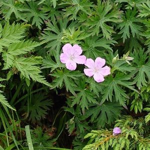 立山 室堂にて ハクサンフウロ フウロソウ科 フウロソウ属草丈30~80cmの多年草。茎の基部は倒伏し、下向きの伏毛が生える。根出葉は長い葉柄がある。 茎葉は葉身は5角形、長さ、幅とも5~10cm。掌状に5深裂し、裂片は菱状倒卵形、1~3回3中裂し、裂片は細長い。表面には短い伏毛が、縁や裏面脈上には密に毛がある。