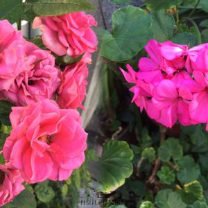 ピンクのミニバラとゼラニュウム 電器店のお花