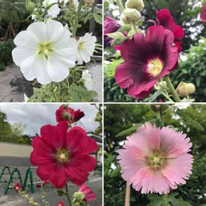 お散歩途中のタチアオイ達。 色も花びらのカタチもそれぞれ、みんな可愛い。