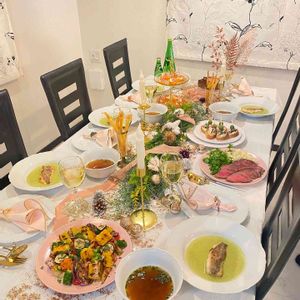 メリークリスマス🎄🎁🎅 昨夜のディナーです🍽 娘家族招待して次女と前日から準備して作りました〜😋 皆んな喜んでくれて楽しいイブでした。🌉 中心に飾ってるリース横長バージョン今年も作り置いてみました。 食卓が華やかに❣️