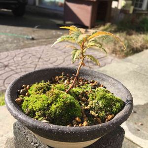 庭に芽を出した覚えのない植物 葉の形が面白いので盆栽風に植えてみた 春になったら何かがわかるかも?!