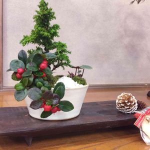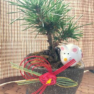 もうすぐお正月🎍 ミニ盆栽に飾りを付け、干支のねずみ🐭をのせてみました😊