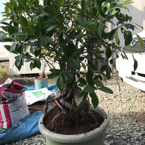 これが盆栽と言えるのかは、微妙ですが、植え替えした時の、再投稿でごめんなさい🙏 樹齢20年のガジュマルです😊 本来ならカッコイイ植木鉢に植えたいところですが、まだ根の作り込み途中で、悩み多きガジュマルです💦