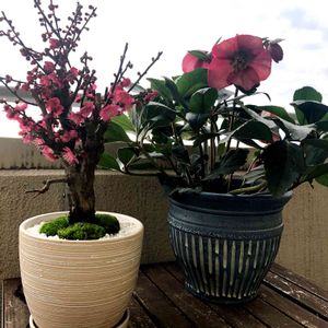 梅です。 選定を全くしていなかったのにこんなに咲いてくれてありがてえ 今年はちゃんと剪定するで。 盆栽ってほどじゃないけど頑張ってくれたうちの梅ちゃん見てほしいからコンテスト参加しますww