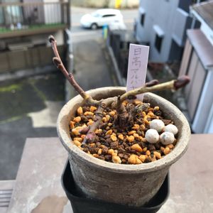 先日お迎えした初めての盆栽(1200円) ペラペラの白いプラ鉢に入っていたので 浅い鉢を購入して植え替え。 受け皿が無い為500円引きになりました👏 開花💠が楽しみです。