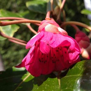 ロドレイア 別名シャクナゲモドキ シャクナゲに似た葉 下向きに付いた花 薄茶の蕾 樹木医の庭に咲く。