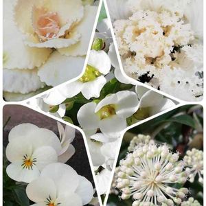 こんにちは! 令和ホワイトクリスマスに、部外者ですが参加させて下さい。 我が家で今日咲いている白いお花を集めてみました。 葉牡丹2種類 スイートアリッサム ヤツデの花 ビオラ
