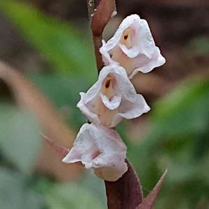 シュスラン 本州(栃木県以南)~沖縄 常緑広葉樹林下に生える ☘️🌱は濃緑色、ビロード状の光沢が有り中脈は白く目立つ 🌸💠は紅を帯びた白色で平開 しない。新芽は匍匐し伸びる 右上 赤い所で根を出している オオミヤマウズラ(ガクナン) 2008年愛知大特任教授により発表されましたが新種としての登録はされてない。最初は愛知県、高知県でしたが今は本州(中部地方以西)に成っています ミヤマウズラとシュスランの自然交雑種とされています。 ☘️🌱はミヤマウズラとシュスランの中間形で光沢は無く白斑も少ない。新芽は匍匐して伸びるが根の出る所が違う、 右下 くの字に曲がった上部に根が有ります。 ミヤマウズラについては省略