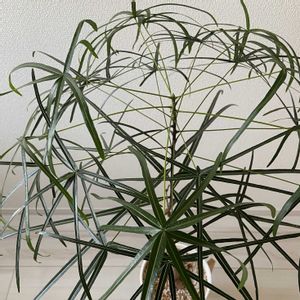 ブラッサイアをお迎えして南西のコーナーがいい感じになりました😊傘をいっぱい☂️さしたような柔らかな感じがアンブレラツリー🎄🌲と言われる由縁なのやかなぁと思いました😊葉っぱの優しい感じの色合いも大好きです〜😊 太い幹にツヤのある大きな葉が 放射線状に広がり、 ボリュームたっぷりの存在感。 時間が経つと木質化する幹も 白木で美しいです。 大きな葉が上の方で傘を広げたような形から 英名は“アンブレラツリー”。 生育旺盛で育てやすい植物。 耐陰性、耐寒性があり、乾燥にも強いです。 【置き場所】 室内の明るい場所に置きましょう。 光を好みますが、耐陰性もあります。 春〜夏は屋外に置くこともできますが、 直射日光で葉が焼けてしまうこともあるので、 遮光するか、明るい日陰に置きましょう。 耐寒温度は約7℃。 シェフレラの仲間の中では寒さにやや弱い ですが、室内では問題なく育てられます。 【水やり】 土の表面がすべて乾いたら、 鉢底から水が出るまで たっぷり水を与えてください。 鉢底にたまった水は捨ててください。 太い幹の中にたくさん水分を蓄えているので、 水の与えすぎはNG。 特に真夏と冬場は水やりの間隔をしっかり長めに。 蒸れや根腐れで木が弱るリスクを減らせます。 【葉水】 湿潤な環境を好みます。 空気が乾燥する時期は霧吹きで葉や その周りに潤いを与えるように しましょう。 【植え替え】 長く育てて根詰まりしてきたら 植え替えが必要となります。 5~9月にひとまわり大きな鉢に植え替えます。 ブラッサイアを含むシェフレラ属の植物は 真夏や冬に植え替えると不調を起こしやすいので この時期は避けたほうがよいです。 鉢が割れてしまった、など どうしてもすぐに植え替えが必要な場合は なるべく根をいじらずに植え替えると 不調のリスクを軽減できます。 土中の蒸れが苦手な植物なので 植え替えに使用する土は 水はけの良いものがおすすめです。 【剪定】 横の枝があまり出ず、樹姿が乱れにくい植物。 それでも長く育てるうちに バランスが悪くなってきた場合は 剪定をして枝ぶりを整えましょう。 時期は春〜秋がおすすめです。 ブラッサイアは 時間がたつと幹が白っぽく木質化し 堅くなります。 堅くなると切りにくくなるので、 幹が緑色のうちに剪定すると 柔らかく切りやすいです。