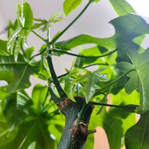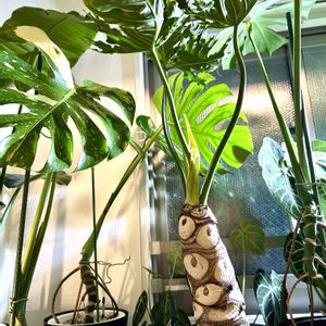 お迎え😊憧れの目玉おやじをお迎えしました😊フィロデンドロンセロームホープ😊モンステラと相性バッチリです👌👍もう一つブラキキトン・アケリフォリウス ブラキキトン・アケリフォリウスは、オーストラリア東海岸原産の落葉高木で、**「フレームツリー」**とも呼ばれ、晩春から初夏にかけて鮮やかな赤い花を咲かせます。幹が膨らみにくく、カエデのような大きな掌状の葉が特徴で、乾燥に強く育てやすい植物です。耐寒性は0℃以上で、冬は室内管理が適しています。 主な特徴 花:晩春から初夏にかけて、木全体を覆うように鮮やかな赤い花を咲かせます。燃えるような見た目から「フレームツリー」と呼ばれます。 葉:カエデに似た掌状の葉で、切れ込みがあり、葉は大きく光沢があります。 幹:ボトルツリーの中でも根本が膨らみにくいのが特徴で、シュッとした樹形になります。 育て方 日当たり:日当たりの良い場所を好みますが、夏の強い直射日光は葉焼けの原因になるため、30~50%の遮光が必要です。 耐寒性:0℃以上で管理するのが適しており、寒さに弱い幼木は冬に室内へ取り込む必要があります。 水やり:乾燥に強いため、土の表面が乾いたらたっぷりと水を与えます。特に冬は乾燥気味に管理しましょう。 フィロデンドロン・セローム・ホープは、一般的なセロームに比べて葉茎が短く、コンパクトにまとまるように品種改良された観葉植物です。深く切れ込んだ大きな葉が特徴で、耐陰性が強く、初心者でも育てやすいとされています。 育て方 置き場所: 年間を通して明るい日陰に置きます。 耐陰性がありますが、暗すぎる場所に置くと葉が軟弱になることがあります。 夏の直射日光は葉焼けの原因になるため、避けるようにします。 水やり: 春から秋の成長期には、土の表面が乾いたらたっぷりと水を与えます。 冬は成長が緩やかになるため、水やりの頻度を減らし、土が乾いてから数日後に水を与えます。 過湿になると根腐れの原因となるため、水はけの良い土を使うことが重要です。 用土: 水はけがよい用土を好みます。