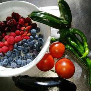 畑ガーデンの夏野菜が少しずつ採れ始めています。 今日のキュウリは何だか2本合体した変な形😊 中玉トマトお初です。 甘唐辛子も食べ頃。 ベリーも少しずつ採れてただ今冷凍庫に溜めております。 ある程度の量になったらジャムにします。🎶