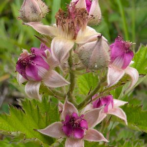 散策路の林縁で見つけたナワシロイチゴの開花から結実までを逆順で載せてみました 実はよくルビーに例えられたりしますが 北海道在住の身としては やはりイクラでしょうか 2枚目の写真は実が球状になる前の状態というより これで完熟なのかも知れません 球状の実を見つける方がとても難しいです また3枚目の写真は結実後の萎れ行く状態かも知れません 4枚目の写真の花は 花弁があまり開かず 反り返った萼片の中心に蕊が隠れるように見える ナワシロイチゴの一般的な特徴を示していますが 中心部の白っぽいのが雌蕊 その周囲の黒っぽいのが雄蕊のようです 最後の写真の花は可愛らしいピンクの花弁を精一杯広げて白桃色の雌蕊をしっかり覗かせています 実は8月上旬 花は6月下旬に撮影したものです