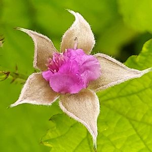 ナワシロイチゴ(バラ科)神奈川県より 2025.06.07撮影📲在来種 赤い花びらはなかなか開きません。開く時は落ちる時…その真ん中に多数の雄しべと多数の雌しべがあるそうです😳🍓 味?結構美味しいですよ🤤🍓