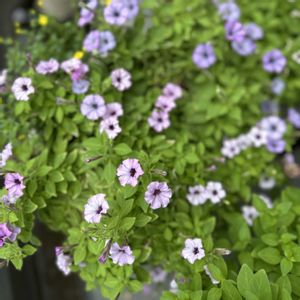 花越 ペチュニア 切り戻しからの復活気味… なんとも言えないおしゃれ色の小輪ペチュニア ユイールかアクアレルか… おもろ親切な藤沢市の お花屋さんすがーでんさんで購入📦 引きだとちょっと乱れてる🤏🤫