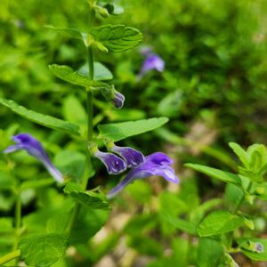 ナミキソウ(波来草) シソ科 タツナミソウ属 6~9月 10~40cm 在来種 多年草 葉は対生 長さ1.5~3.5cmの長楕円形で短柄があり、円頭 やや厚みがあって、両面に軟毛がある 葉縁は鈍鋸歯 葉もなかなか可愛いと思う😊 茎にも軟毛がある 花は青紫色の唇形花 上唇や花冠筒部に毛がある 上唇はカブト状に膨らむ 下唇は幅が広く、ごく浅く3裂し、中央の白色の部分は膨らんでいる 対生する葉の腋に1個ずつつき、2個がそろって同じ方向を向いて咲く (基部でクイッと立ち上がる✨) 海岸で、波が届きそうな場所に生えることからついた名前だそう 私には、その佇まいは波が来るのを見ているかのように感じる