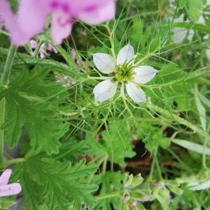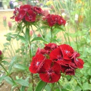 去年蒔いたミックスフラワーガーデンから発芽🌱 そのままお花を見るにはいたらずに越冬して今年はやっと咲いてくれました✨ 初めての美女撫子さん🏵️ 後ろの赤いのはストロベリーキャンドルです(^^;