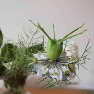 切り花にしていたニゲラちゃんが ますます怪しい感じになりました 種かなー? 強風続きでベランダはめちゃくちゃ! 青虫も飛ばされた!