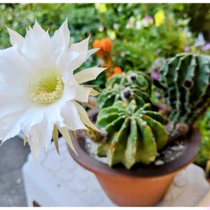 我が家に来て20数年は経ってるサボテンに初めて咲いた花は白い素敵な 花です🤍✨ 大豪丸?それとも棘なし短毛丸でしょうか? 緋花玉も咲いてます💕