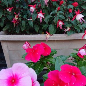 フクシアとニチニチソウ フクシアは、久しぶりに迎えました☺️ ニチニチソウは、去年のこぼれ種からこんなに大きくなりました☺️