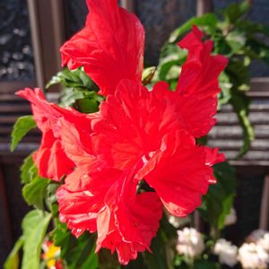 天気が良すぎて、赤いハイビスカスフラミンゴ🌺が、眩し過ぎます😎 二段咲きのハイビスカスまだまだ元気です😆🎵🎵