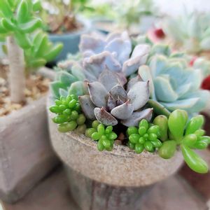 フラリエで行われている多肉とみどりのマルシェに行ってきました😊 マルシェは出店者さんとお話ししながら買えるから楽しいですね お天気も良くて沢山狩ってしまった😆 リベンジのルノーディーンや欲しかったオーストラリアキャプテンヘイもゲットできました♪ 中央のヒラヒラしたコ アルボレセンスウンデュラティフォリアリップルジェイド 名前覚えられない😅 調べてみたらブルーリボンの別名らしいので、ブルーリボンと呼ぶことにします笑 ②ぼたんさんの鉢もゲット😁 ③200円のカンテ様 小さく狩って大きく育てたいと思います😆