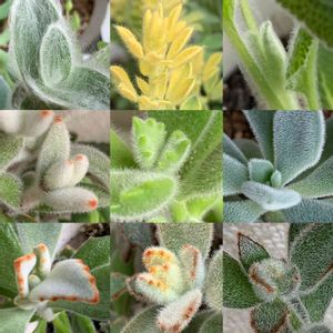 もけもけ大集合😆 左上から右へ 白絹姫、ロータスブリムストーン、ラムズイヤー、福兎耳、熊童子、フロスティー、月兎耳、ゴールデンラビット、黒兎 もけもけ植物欲しい病にかかってます🤣