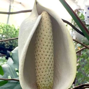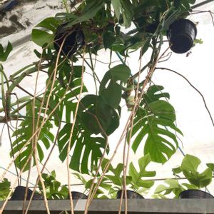 モンステラの日! 気根! 生産しているハウスの中なので、写真はちょっとアレですが…。 このモンステラが花を付けています。 なんと…根元は5号くらいのポット!