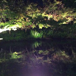 鏡池✨ イルミネーションシーズンが終わると、なばなの里の夜は、静かです❗️ 鏡池は、色づく前のモミジが青々と、それはそれは綺麗でした✨✨ 散策路の木々や花々が、癒しをいっぱいくれました💕