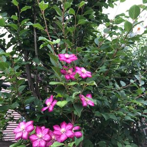 シャラの木に登ったクレマチス ビルドリヨン🌸 シャラの木の樹高を詰めたら、枝が賑やかに…緑が濃いのでちょっと暗め…花が待ちきれないので、ビルドリヨンの🌸で明るく😁 やっと右上の方にシャラの白い花が一輪❣️ 咲き出しました