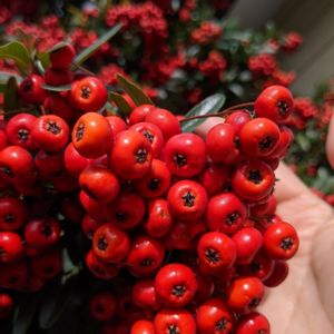 この赤い実❣️大きくてたくさんなってました〜🤩🍀 実の大きさが分かるように、手をそえてみました!☺️🍀 ピラカンサというそうです❣️ なんかおめでたい気持ちになっちゃいました🥰