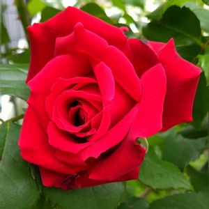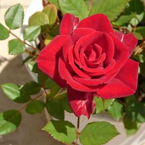 こんにちは👋😃🌂 25年位前にお迎えした、大輪四季咲きの真っ赤な薔薇🌹サンが咲きました🎵😍🎵 大輪より少しだけ小さいかも😊 深紅の薔薇🌹サンを求めていましたが、紅色には近いかもしれません😊