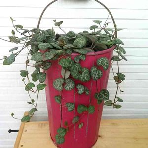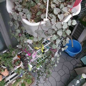 ハートカズラ♡ 以前投稿した時はカゴから少しはみ出す程度でしたが、今では地面に着きそうなぐらい伸びました😊 この先どうしたらいいのかな? やっぱりカット✂️かな?