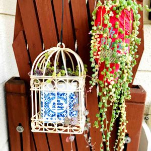 ネックレスの日🏷 参加させていただきま〜す💕 げんげんちゃんからいただいたリメ缶に植えた斑入りグリーンネックレスがもりもりしてきました〜😊 鳥かごの中はリトルミッシーとハートカズラが植えてあるのですが冬越しの間にちょっとスカスカしてきちゃいました😅 もうちょっと頑張ってこんもりになってほしいです💖