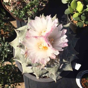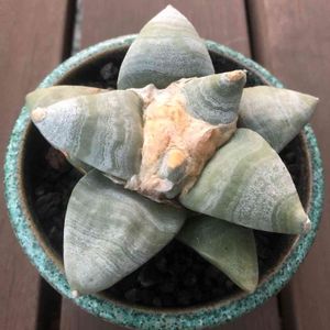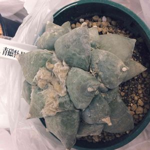アリオカルプス属の青磁牡丹のモンスト。 写真だとサイズがありそうに見えるけど、まだ5cmあるかどうか。 ここからどのように成長してくれるのか楽しみだけど、アリオカルプス属は成長が遅そうだからなぁ(^^;) 長い付き合いになるから嬉しいけど。
