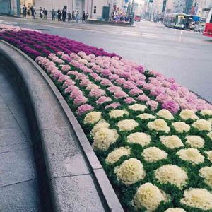 繁華街の広い交差点の四つ角に植えられた葉ボタンの列👏 思わず足が止まりました。😌🎶