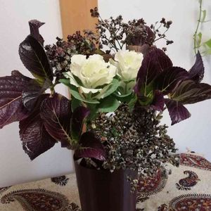 今日のお花🌼玄関のハボタン🌼 寄せ植え用の背の高いハボタンはまだポットのままです。前回のアジサイの紫💜の葉っぱの色は更に深くなり合わせてみました♫ ぐっとシックになりました♡